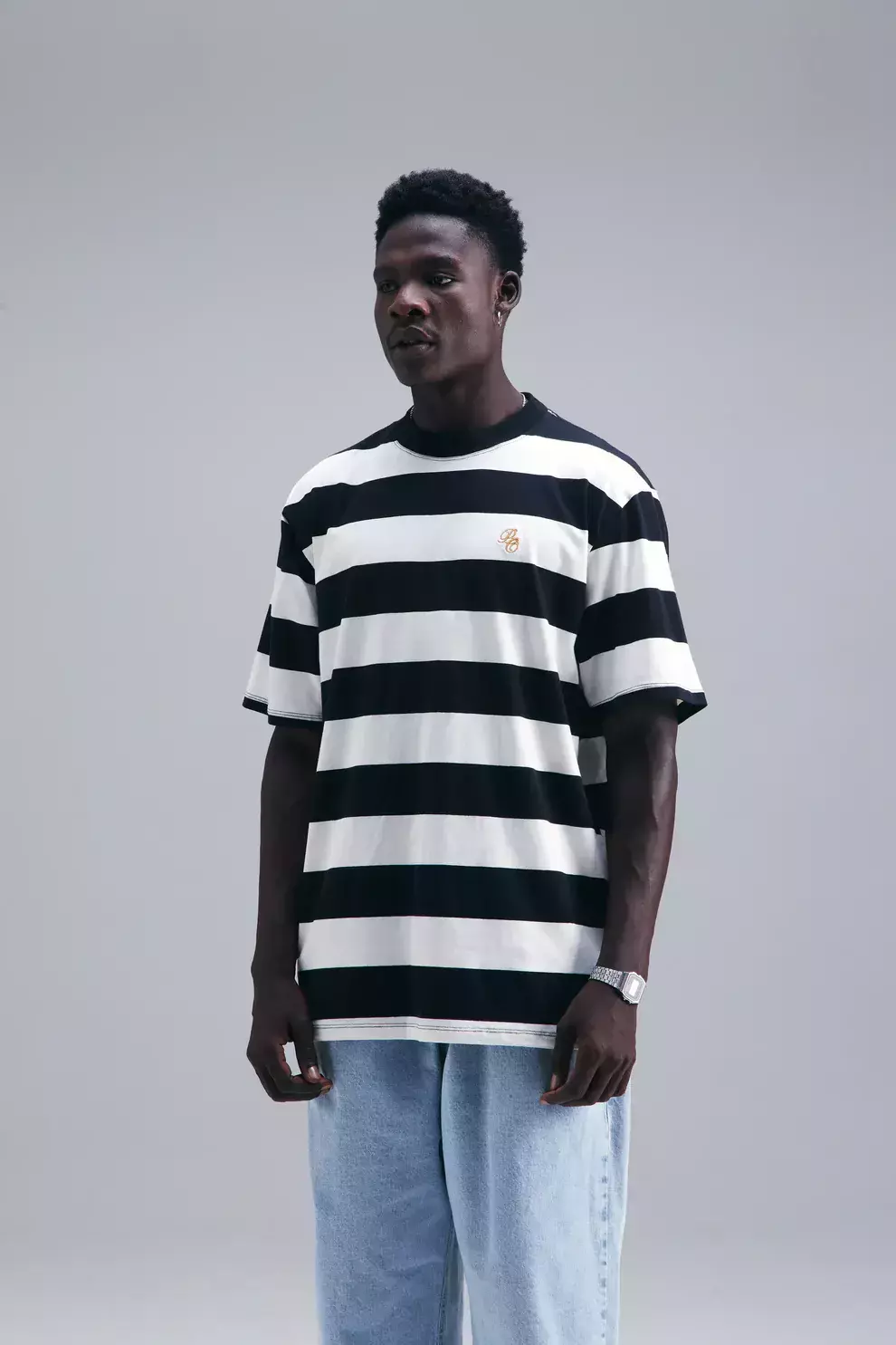 Camiseta listrada fio tinto confeccionada em malha com 97% algodão e 3% elastano, com gramatura de 180g — oferecendo conforto, elasticidade leve e visual marcante.